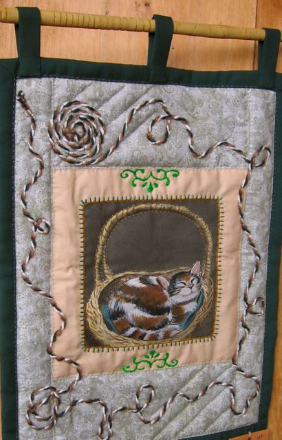 “Angel”. Oleo del pintor norteamericano Abbot Handerson-Thayer, que falleció en 1921. Este fue mi primer trabajo en fototransferencia y la pequeña quilt lleva mi propio crochet, tela de la época y un pedacito de mi vestido de novia.